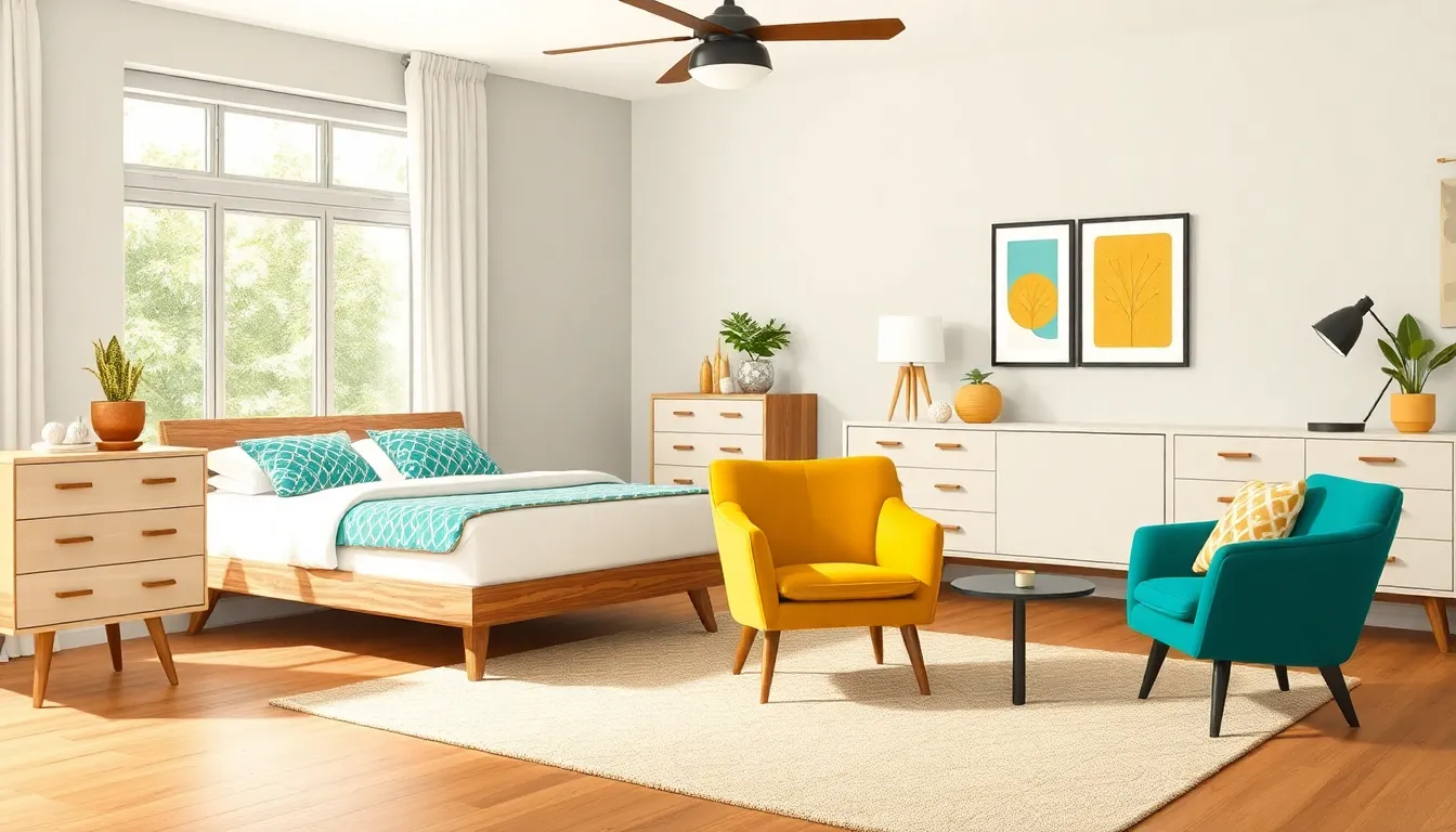 Incorporate furniture with clean lines for an authentic mid-century look. Low-profile beds and minimalist dressers exemplify this style’s simplicity and elegance. Choose vibrant color palettes to evoke energy, including shades like teal, mustard yellow, and avocado green.
